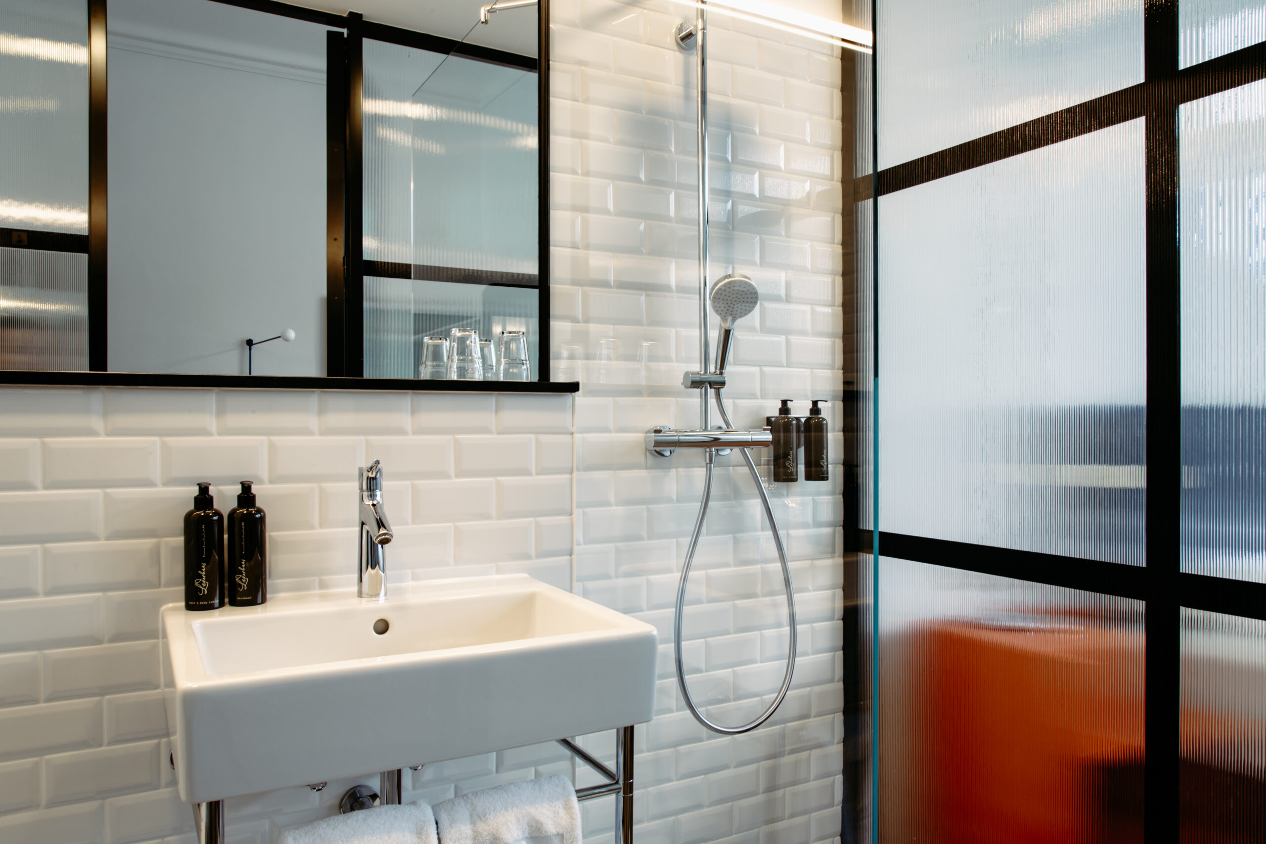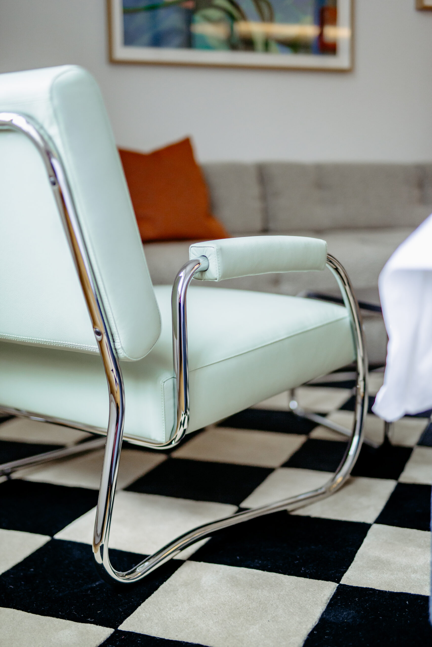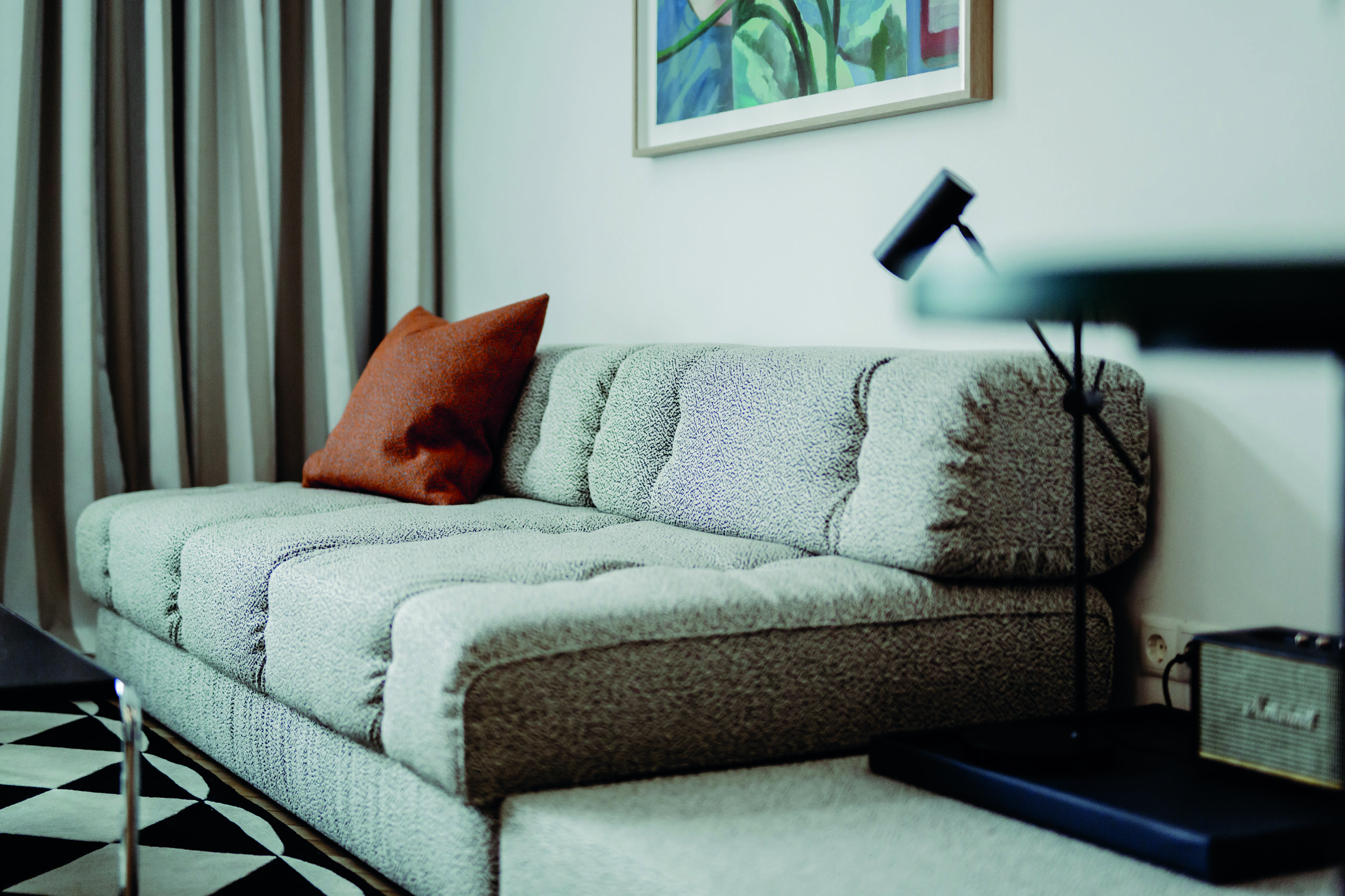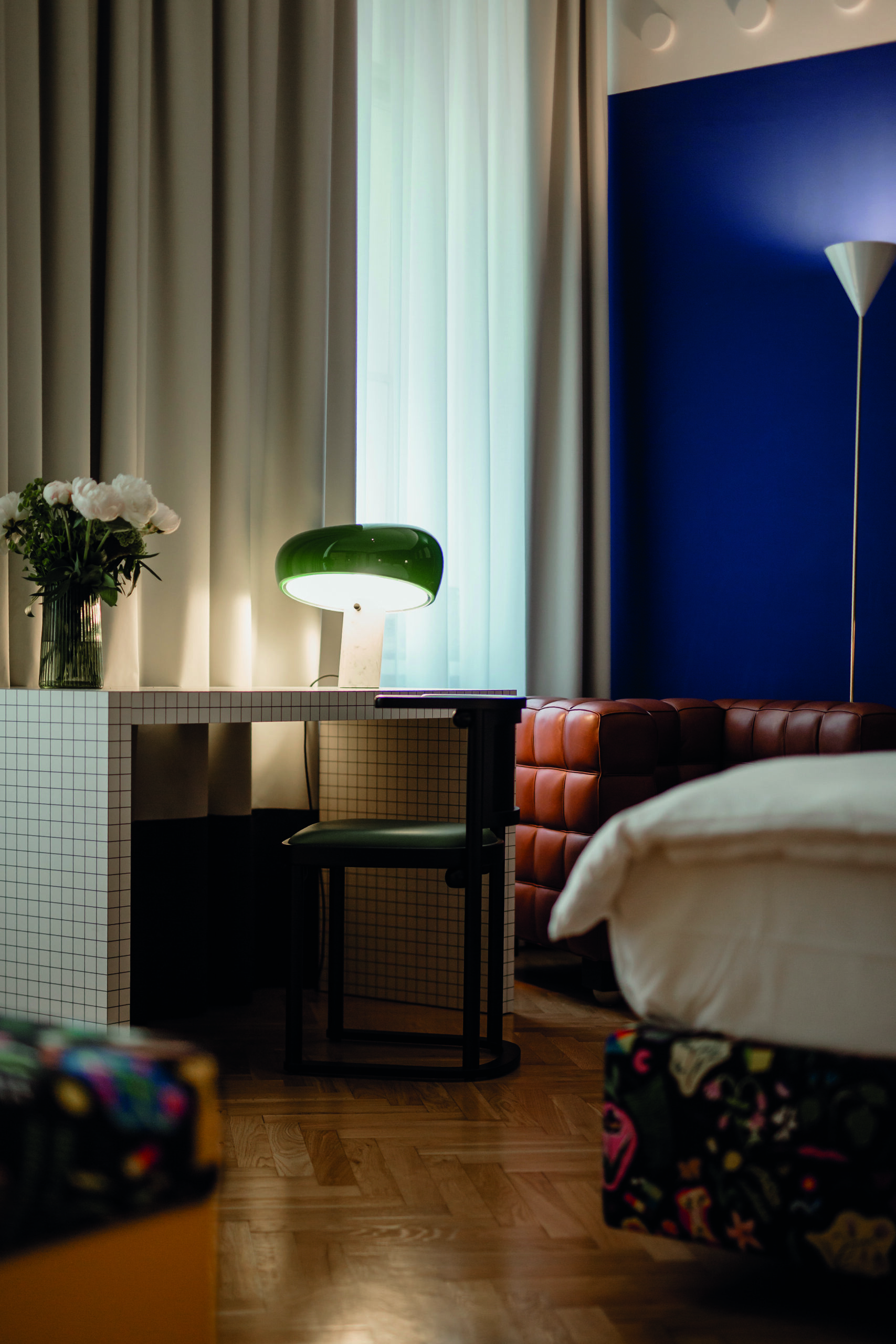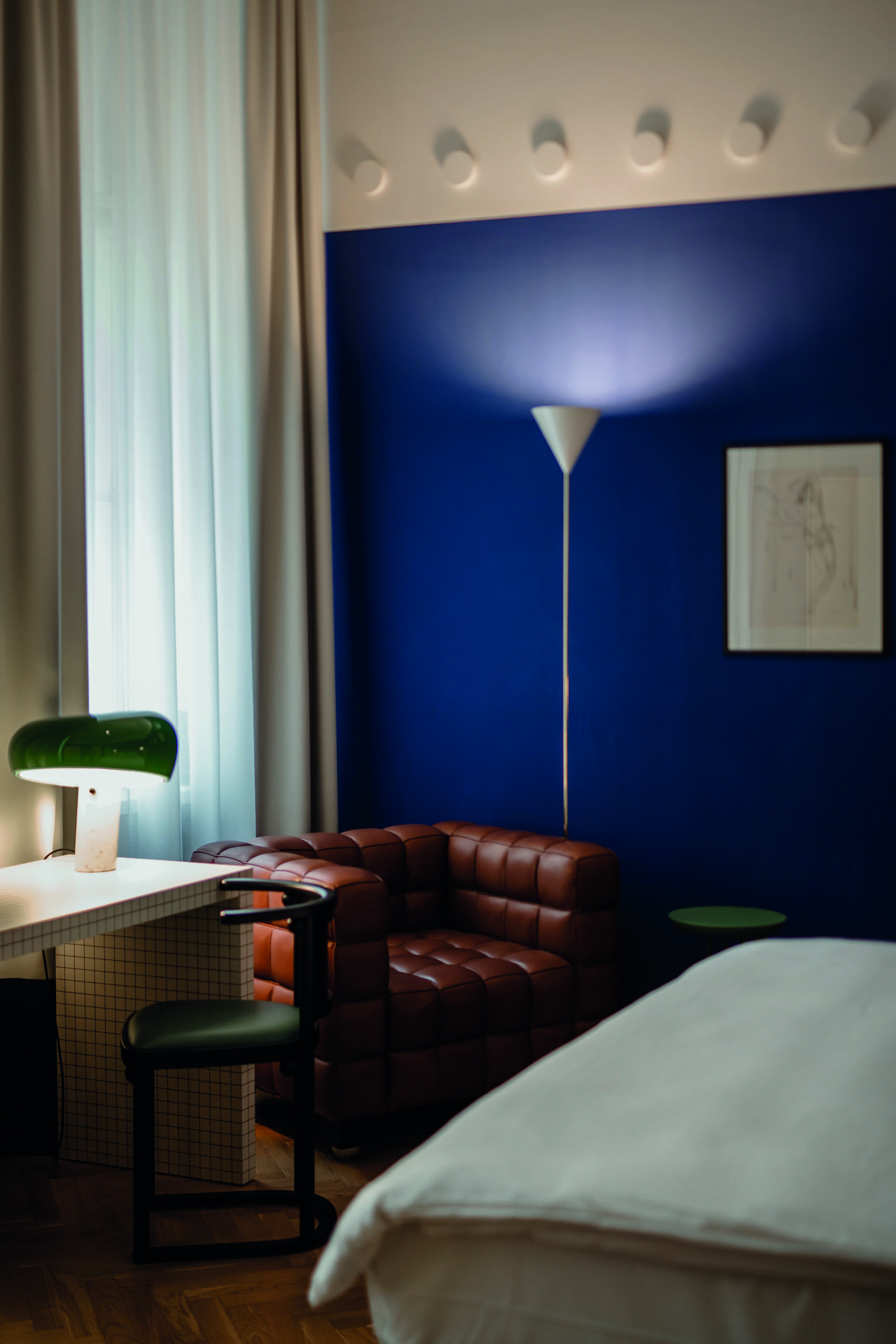Arthur Arbesser, der in Wien aufwuchs, in London studierte und später nach Mailand zog, um für mehrere Jahre für ein führendes Modelabel zu arbeiten, ist bekannt für seine grafische Ästhetik und persönliche Designsprache. So ist es auch das Spiel mit der Geometrie, dem Schachbrett, dem Würfel, die der Gestaltung für Zimmer 30 zugrunde liegt. Das Badezimmer ist ein schwarz-weißer Glaskubus, hergestellt von der steirischen Firma Josef Göbel, die zwei bunt lackierten Nachtkästchen sind dekonstruierte Würfel, angefertigt nach Arthur Arbessers Entwürfen, und um das Bett herum schlängelt sich eine grafische Bordüre der Wiener Werkstätte als Art Fresco an der Wand. Sofa Atrium von Wittmann besteht aus einfachen Blöcken, und Teppich Chess wiederum erinnert an die Fliesen eines Wiener Stiegenhauses. So zieht sich das reduzierte, grafi sche Thema des Würfels auf verspielte Art und Weise durch das gesamte Zimmer. Dass das Bauhaus dank Marcel Breuers Couchtisch Laccio, Charlotte Perriand mit ihrer Lampe Le Grand Bleu und der visionäre Friedrich Kiesler mit dem mintfarbenen, lederbezogenen Freischwinger vertreten sind, macht das geometrische Gestaltungskonzept perfekt. Zur Zimmereinrichtung gehören des Weiteren das Wittmann Doppelbett Spring mit Kopfhaupt Themis sowie der Fledermaus Stuhl von Josef Hoff mann, ebenfalls gefertigt von Wittmann. Die beiden Bilder an der Wand stammen von der österreichischen Künstlerin Xenia Hausner.