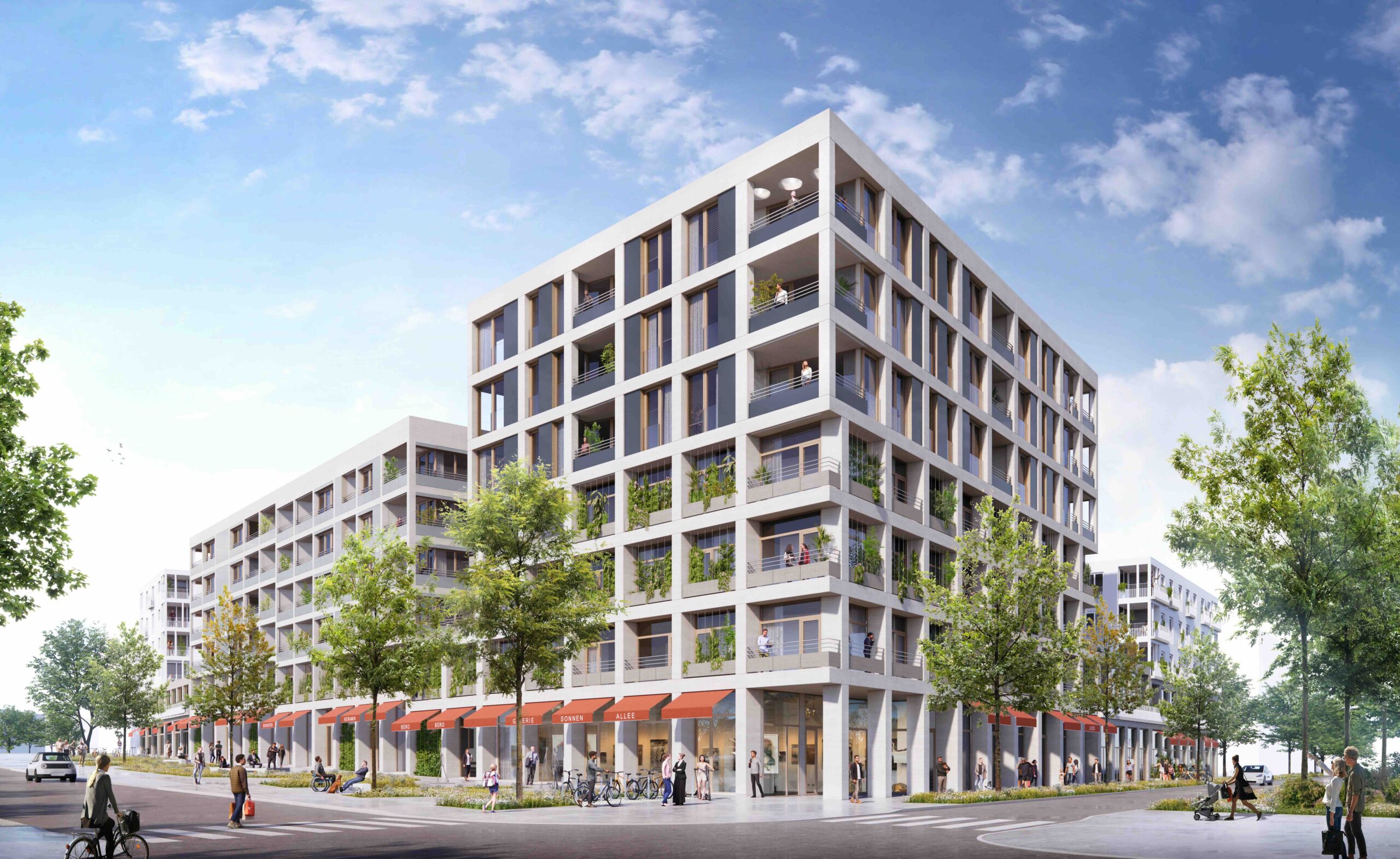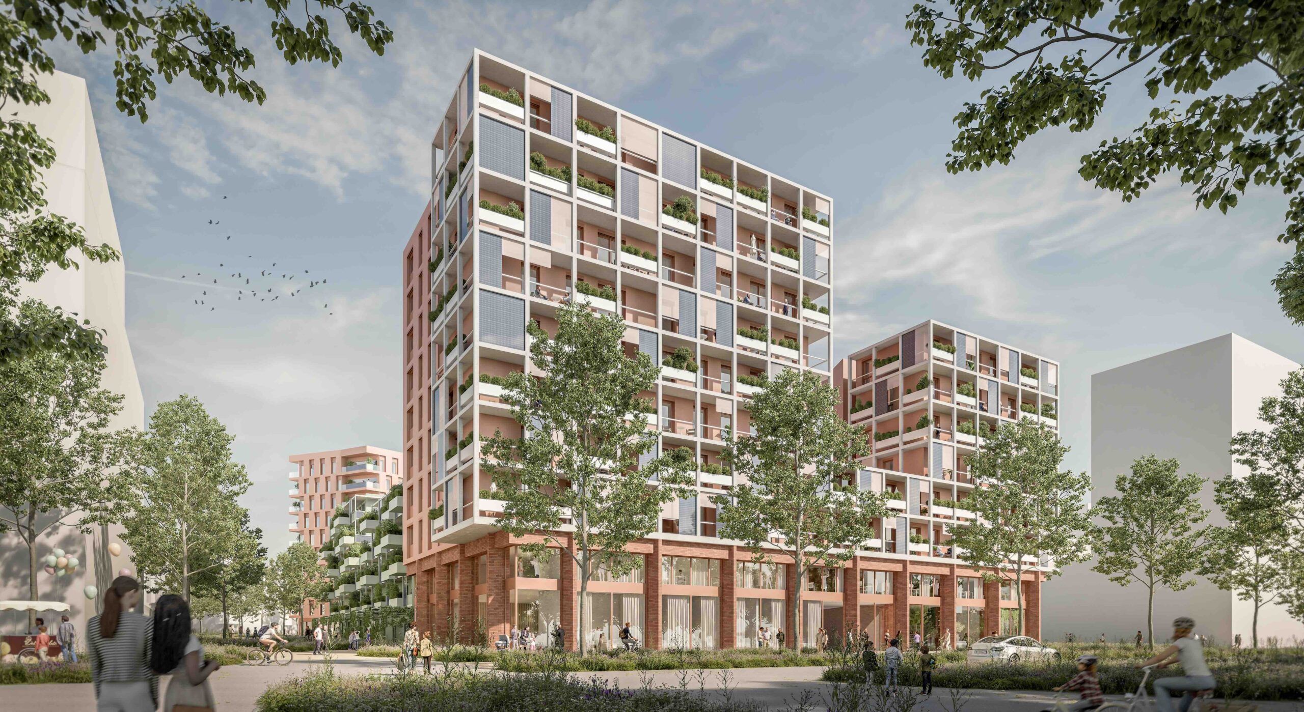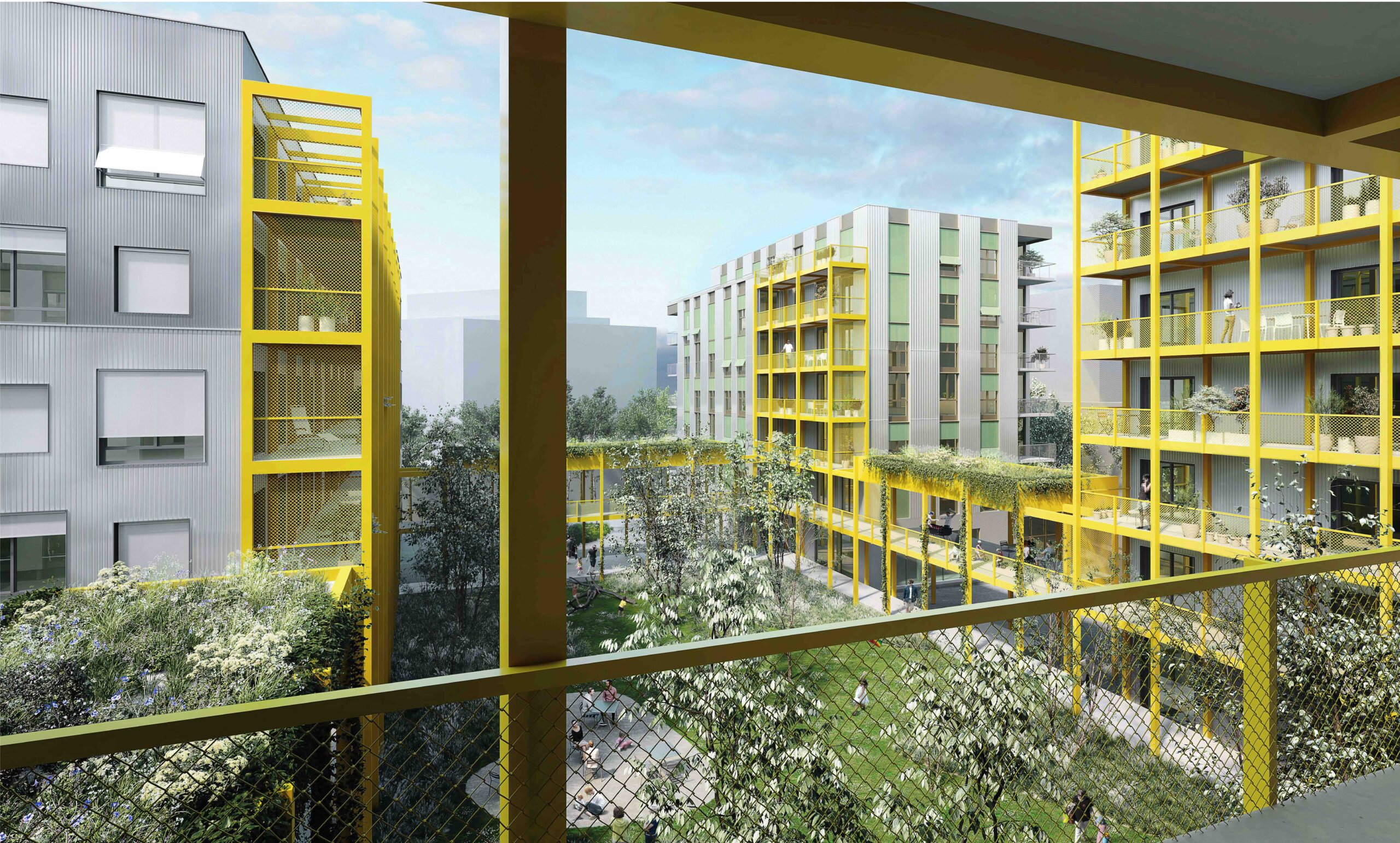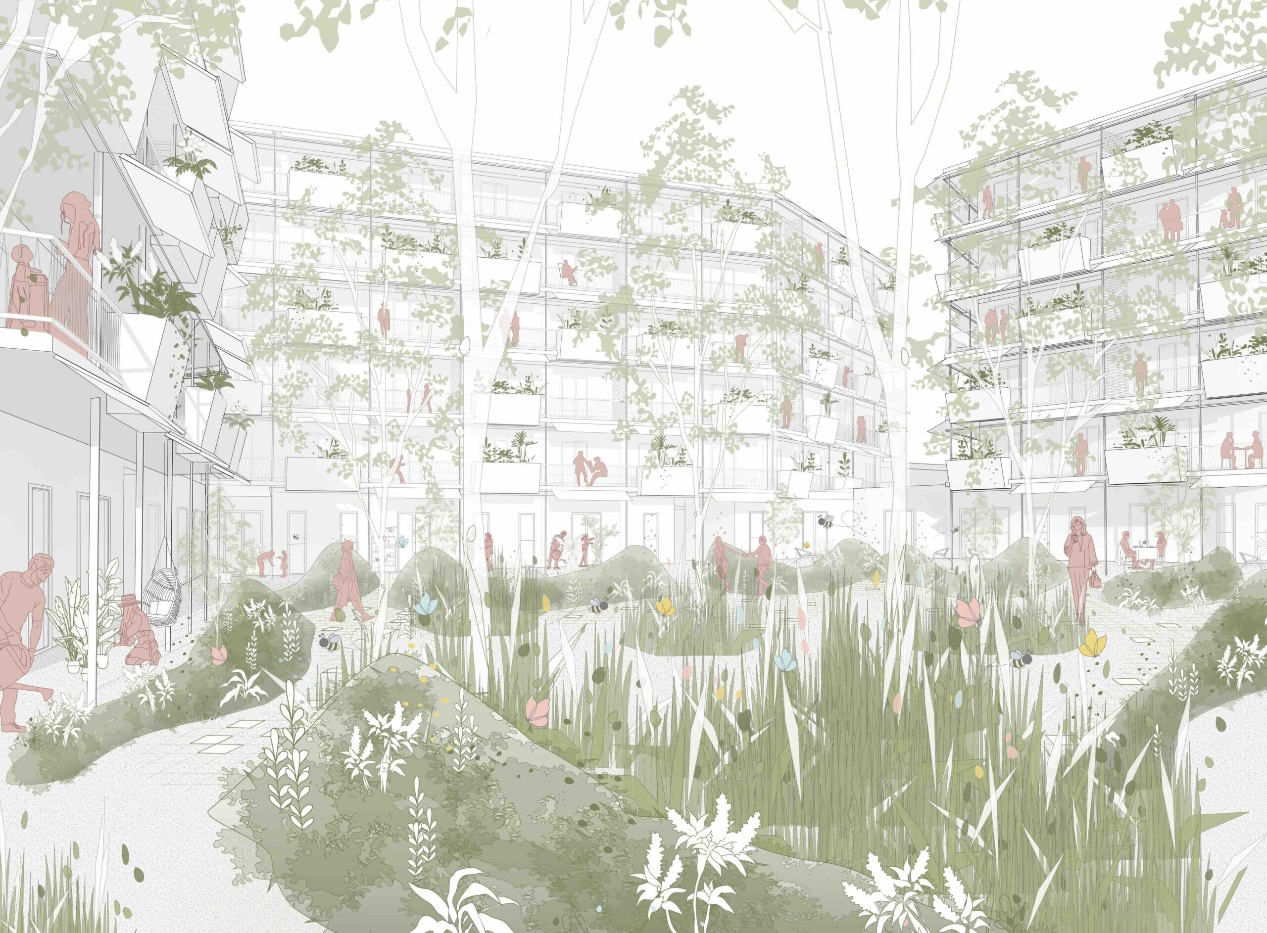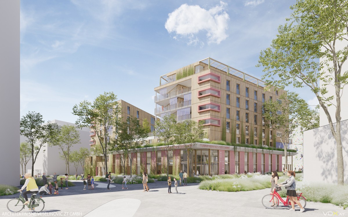 Das Siegerprojekt bietet Raum zum Wohnen und Arbeiten und zeichnet sich durch seine durchgängige Sockelzone aus, die sich zum Pocket Park hin öffnet. So entsteht ein ruhiger Innenhof, der den Bewohner*innen als Rückzugsort dienen und zum Verweilen einladen soll. - F12 – Auftraggeber: ÖVW Österreichisches Volkswohnungswerk Gemeinnützige GmbH